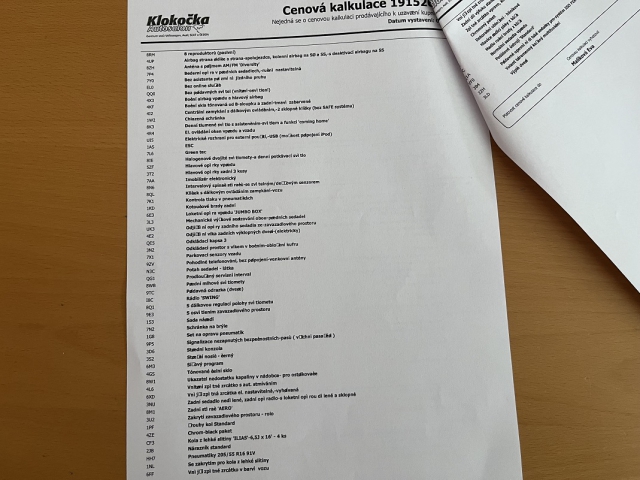 | výbava: ABS, 6 x airbag, centrál dálkový, centrální zamykání, dělená zadní sedadla, digitální aut. klimatizace, el. okna, el. zrcátka, imobilizér, indikátor parkování, mlhovky, multifunkční volant, nastavitelný volant, natáčecí světlomety, originál autorádio, ostřikovače světlometů, palubní počítač, posilovač řízení, protiprokluzový systém kol (ASR), satelitní navigace, senzor stěračů, senzor světel, senzor tlaku v pneumatikách, stabilizace podvozku (ESP), střešní nosič, tažné zařízení, tempomat, tónovaná skla, vyhřívaná sedadla vpředu, vyhřívaná zrcátka, xenonové světlomety, zadní stěrač, náhon přední | |